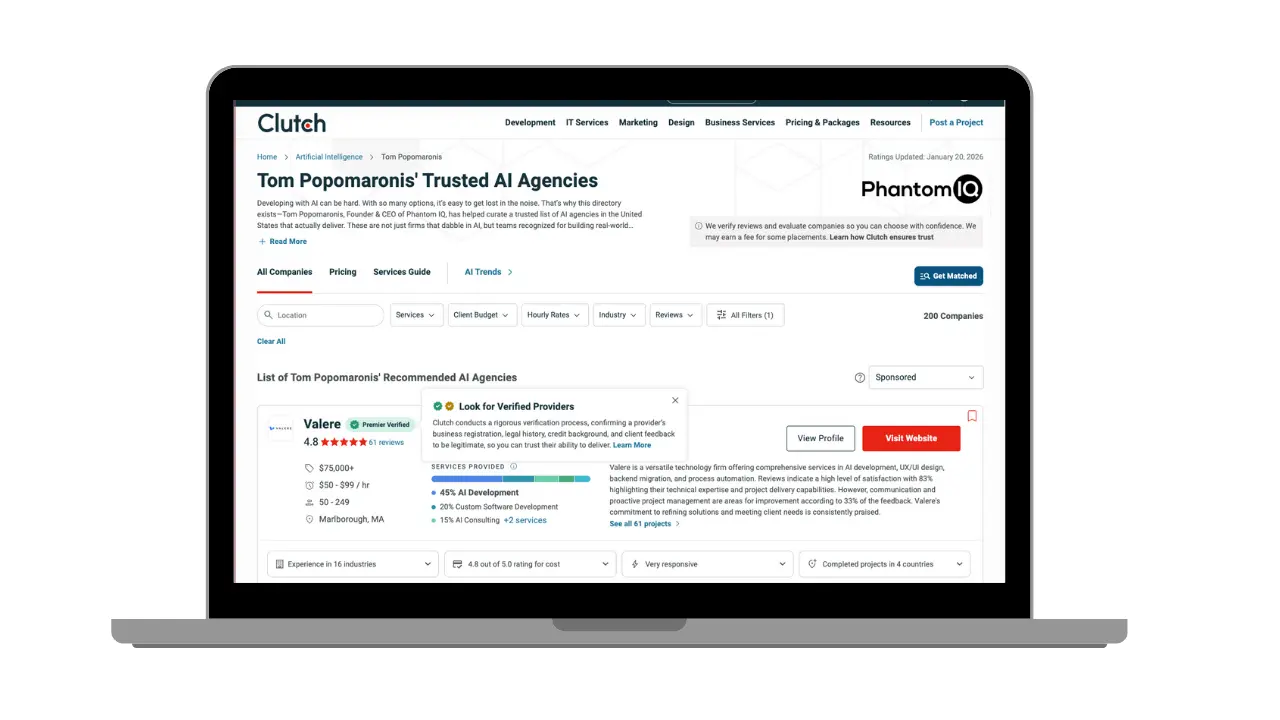 Tom Popomaronis, Founder & CEO of Phantom IQ, curated this list specifically to cut through the noise of the current AI boom. The ranking highlights agencies that are “not just firms that dabble in AI, but teams recognized for building real-world solutions.”